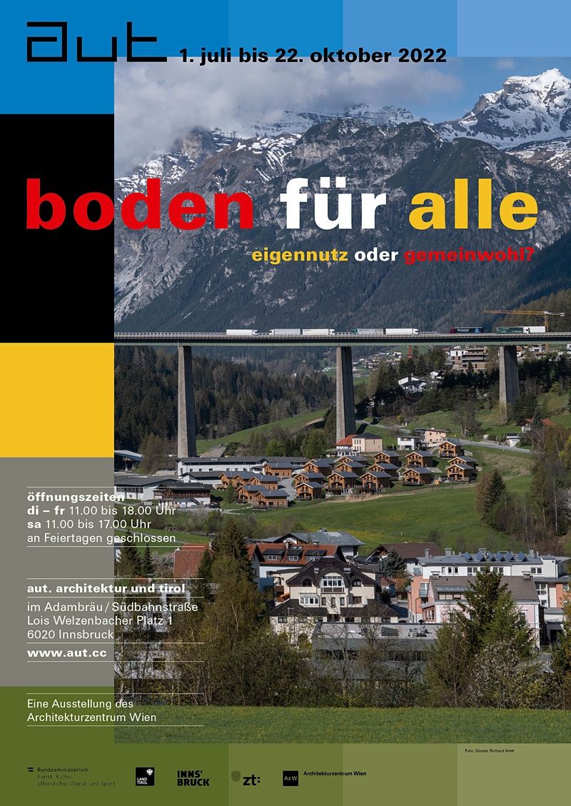 Ergänzend dazu widmet das aut im Herbst mehrere Veranstaltungen der Thematik und beleuchten dabei auch die Situation vor Ort in Tirol. So wird das von Landesrat Johannes Tratter initiierte Impulspapier "Alles Tun hat Raumbezug" vorgestellt und mit den Mitgliedern der Arbeitsgruppe diskutiert. Christoph M. Achammer wird in einem Vortrag konkrete Lösungsvorschläge für den Stopp der Flächenverschwendung aufzeigen, Roland Gnaiger Möglichkeiten einer nachhaltigen Siedlungsentwicklung vorstellen. Der Klimatechniker Stefan Holst widmet sich ganzheitlichen Klima- und Energiekonzepten und die Stadtbaurätin von München Elisabeth Merk den Fragen nach einer zukunftsorientierten Stadtentwicklung.
