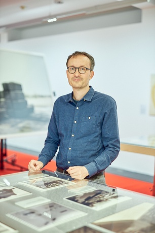 vai-Kurator Clemens Quirin führt durch die Ausstellung "POWER". Er erklärt die Zusammenhänge bzw. Wechselwirkung von Geopolitik, politischen Institutionen und Bewegungen mit der planerischen Arbeit in Architektur, Ingenieurwesen und Landschaftsgestaltung für die Erstellung von Infrastruktur.