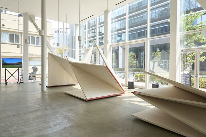 Die Holzskulpturen von Atelier Andrea Gassner in dieser Schau öffnen sich wie übergroße Origami in Anspielung auf die Tektonik heutiger Holzarchitektur mit flächigen Werkstoffen. Der Zauber von Holz liegt in seiner Schönheit und Flexibilität, seiner Leichtigkeit und statischen Kraft. Die Relevanz als Baumaterial der Zukunft verdankt Holz der regionalen Verfügbarkeit und seiner rundum positiven Klimawirksamkeit.