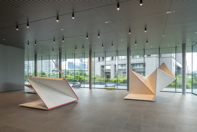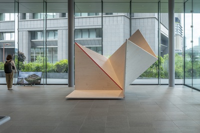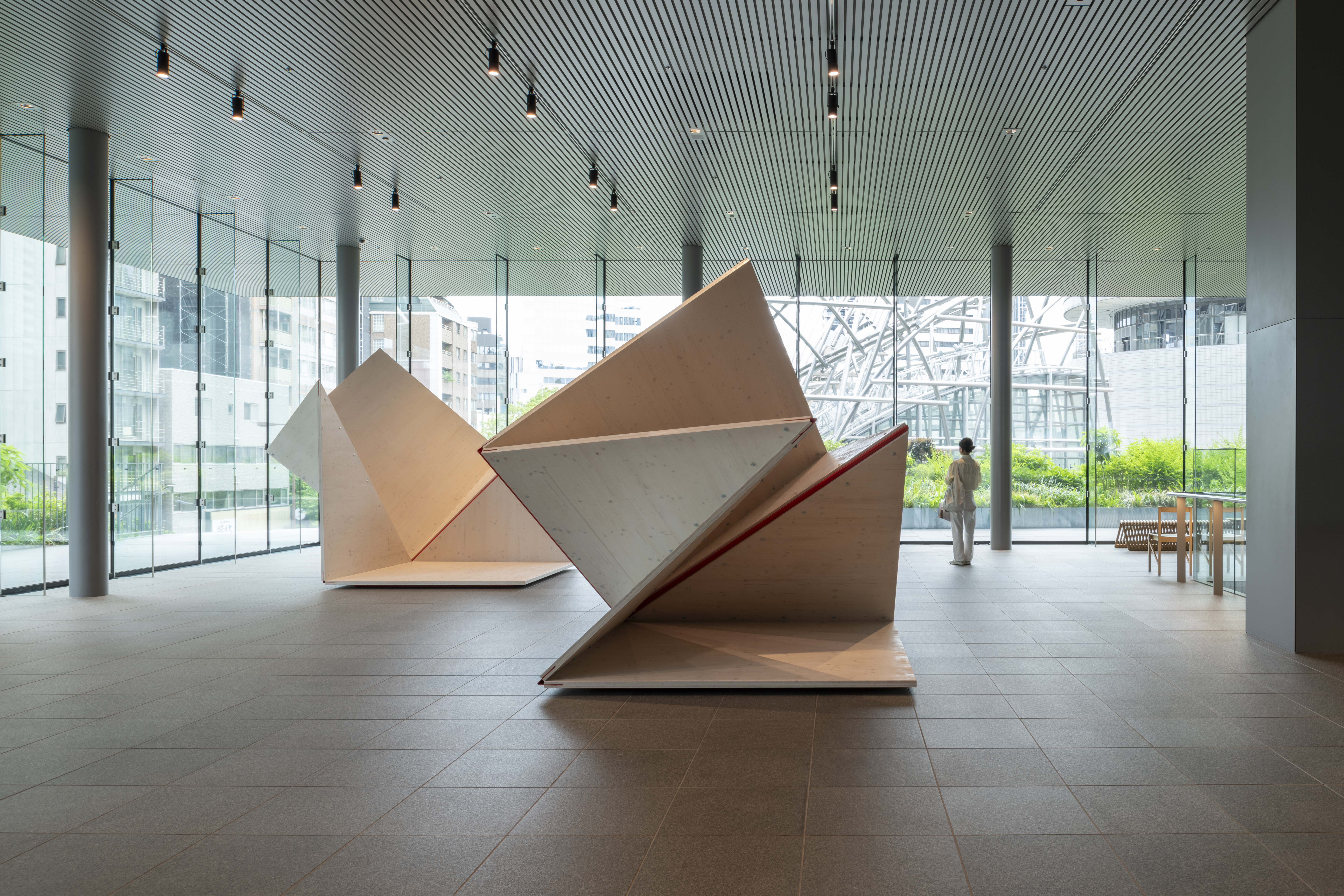 Die drei Holzskulpturen von „verywood“ öffnen sich wie übergroße Origami in Anspielung auf die Tektonik heutiger Holzarchitektur mit flächigen Werkstoffen. Der Zauber von Holz liegt in seiner Schönheit und Flexibilität, seiner Leichtigkeit und statischen Kraft. Die Relevanz als Baumaterial der Zukunft verdankt Holz der regionalen Verfügbarkeit und seiner rundum positiven Klimawirksamkeit.