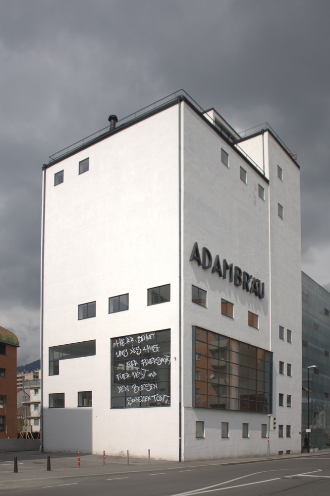 Im Rahmen der Ausstellung "Michl Schmidt + Peter Wendl: Verteidigung des Normalzustands" erhielt das Adambräu-Gebäude einen Haussegen.