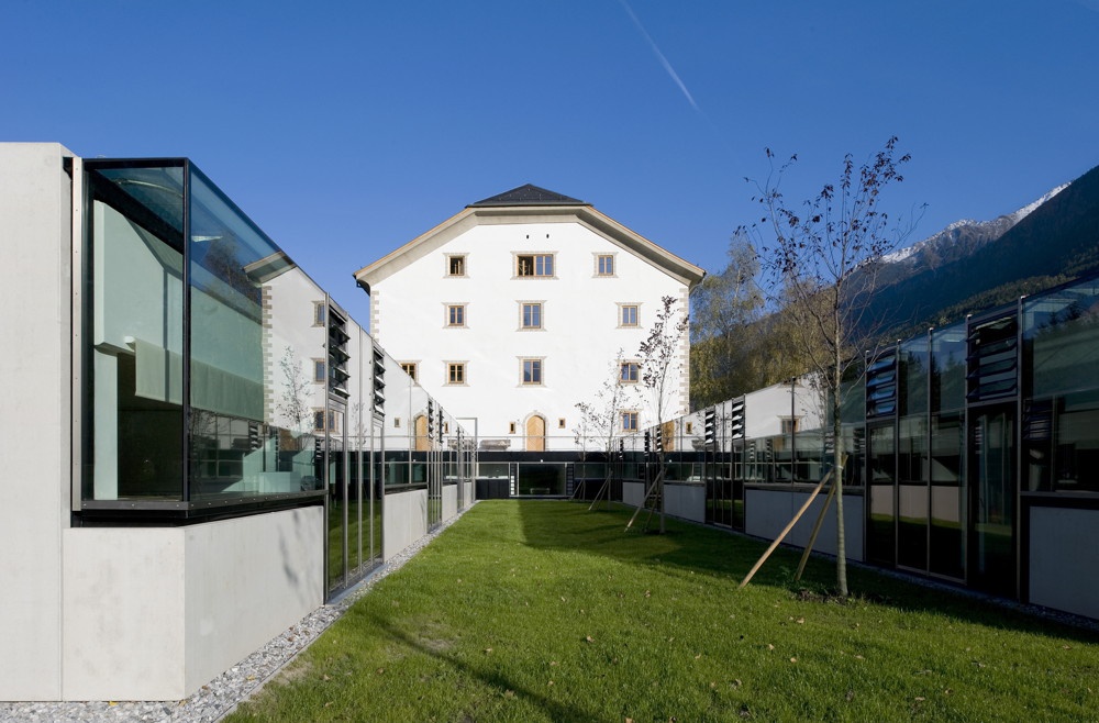 Im 300 Jahre alten Bestandsbau wurden die baulichen Strukturen freigelegt, klare Eingriffe fanden nur dort statt, wo es auch aus funktionellen Gründen sinnvoll erschien. Direkt an den Altbau angeschlossen wurde ein lang gestreckter, leicht in den Boden abgesenkter Neubau errichtet. Zwei Zimmertrakte und der Verbindungsgang umschließen U-förmig einen begrünten Innenhof. Eine klare Formensprache – Wände und Decken sind schalrein in Ortbeton errichtet – kontrastiert als dezidiert zeitgenössische Ausformulierung mit dem historischen Bestand, großflächige Verglasungen schaffen optimale Lichtverhältnisse in den betont einfach eingerichteten Zimmern. Die begrünten Dächer, die nur knapp aus dem Gelände emporragen, lassen den Blick frei auf das barocke Stift, das Schigymnasium von Othmar Barth, Wald
