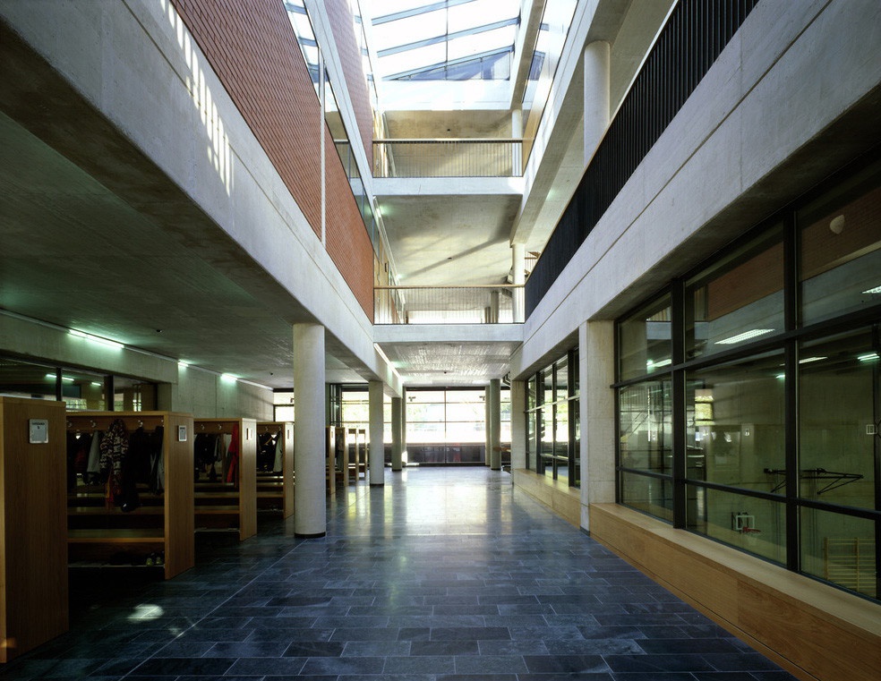 Die kompakte, gleichzeitig sehr durchlässige Anlage unmittelbar am Rand der Haller Altstadt beinhaltet mit einer zehnklassigen Hauptschule, dem Turnverein Hall und dem Eissportcenter drei unabhängige Funktionen. Unter Rücksichtnahme auf den vorhandenen Grünraum wurde der südliche Teil nur unterirdisch bebaut und alle Hochbauten in einem Gebäude vereint, das in seiner Transparenz den Außenraum atmosphärisch ins Gebäude holt.