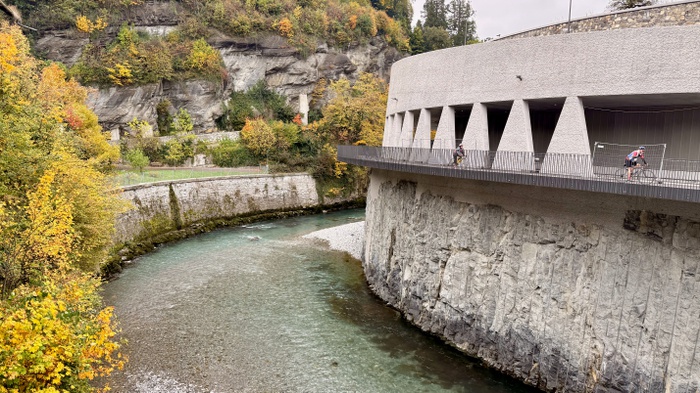 Begegnung, Route 68°°In der Kapfschlucht wurden in den letzten Jahren zentrale infrastrukturelle Maßnahmen umgesetzt. Brücken, Galerien sowie Stütz- und Sicherungsbauten greifen in den Fels, Hänge wurden stabilisiert, Wasserläufe und Wege neu geordnet. Diese Eingriffe dienen dem Hochwasser- und Katastrophenschutz und sichern einen sensiblen Übergangsraum zwischen Stadt und Landschaft.