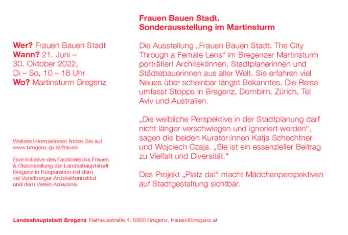 Die Ausstellung „Frauen Bauen Stadt. The City Through a Female Lens“ im Bregenzer Martinsturm porträtiert Architektinnen, Stadtplanerinnen und Städtebauerinnen aus aller Welt. Sie erfahren viel Neues über scheinbar längst Bekanntes. Die Reise umfasst Stopps in Bregenz, Dornbirn, Zürich, Tel Aviv und Australien.