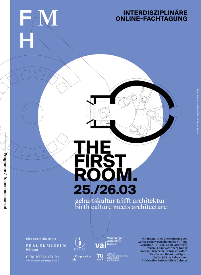 Der Titel THE FIRST ROOM ist dem Healthcare Schwerpunkt am Institut für Architektur und Entwerfen der TU Wien entnommen, in dessen Rahmen Studierende im WS 20/21 Räume für den Start ins Leben entworfen haben. (Leitung Prof.in Tina Greogric. Betreuung: Univ. Ass.in DI in Evelyn Temmel, Univ. Lekt.in DI in Josephine Herrmann. Externe Expertin: DI in Anka Dür, IG Geburtskultur a-z)